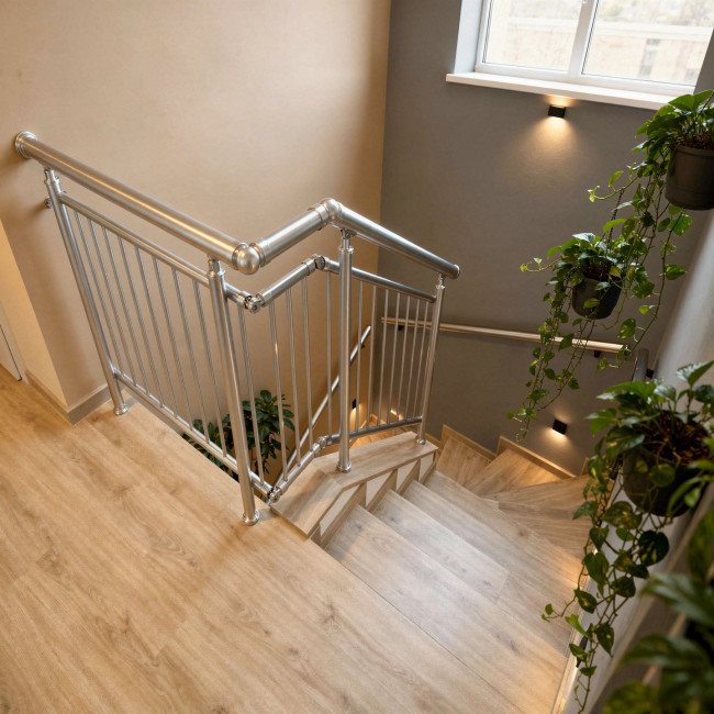 Hliníkové okrúhle zábradlie na schody s horným kotvením do schodnice. Uvedená cena je priemerná cena tohto modelu za 1bm (bežný meter) materiálu s celkovou výškou 900mm. To znamená kotvenie, stĺpiky, madlo, výplne, záslepky, perá, príruby (bez montáže, dopravy a spotrebného materiálu). Rozmery tohto modelu zábradlie sa upravujú podľa potreby a umiestnenia z 6m profilov. Nejedná sa o zmontované zábradlie, ale nahrubo narezané profily, ktoré sa stavajú upravujú podľa miesta montáže. Všetky rozmery sa tak dajú upraviť pre dané miesto a konkrétne potreby. Montáž zábradlí nie je v cene, ale musí sa objednať samostatne. Tento model je vhodný pre umiestnenie do vnútorných aj vonkajších priestorov.