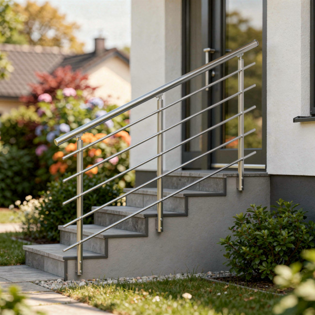 Hliníkové okrúhle zábradlie na schody bočné kotvenie Uvedená cena je priemerná cena tohto modelu zo 1bm (bežný meter) materiálu s celkovou výškou 900mm a čtiřech vodorovných výplní. To znamená kotvenie, stĺpiky, madlo, výplne, záslepky, perá (bez montáže, dopravy a spotrebného materiálu). Rozmery tohto modelu zábradlie sa upravujú podľa potreby a umiestnenia z 6m profilov. Nejedná sa o zmontované zábradlie, ale nahrubo narezané profily, ktoré sa stavajú upravujú podľa miesta montáže. Všetky rozmery sa tak dajú upraviť pre dané miesto a konkrétne potreby. Montáž zábradlí nie je v cene, ale musí sa objednať samostatne. Tento model je vhodný pre umiestnenie do vnútorných aj vonkajších priestorov.