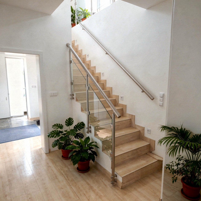 Hliníkové okrúhle zábradlie na schody bočné kotvenie. Uvedená cena je priemerná cena tohto modelu za 1bm (bežný meter) materiálu o celkovej výške 1000mm. To znamená kotvenie, stĺpiky, madlo, držiaky skla, záslepky, perá, príruby a bezpečnostné sklo. Rozmery tohto modelu zábradlie sa upravujú podľa potreby a umiestnenia z 6m profilov. Nejedná sa o samostatné 1 metrovej celky, ale všetko sa stavia na mieste postupne. Všetky rozmery sa tak dajú upraviť pre dané miesto a konkrétne potreby. Tento model je vhodný pre umiestnenie do vnútorných aj vonkajších priestorov.